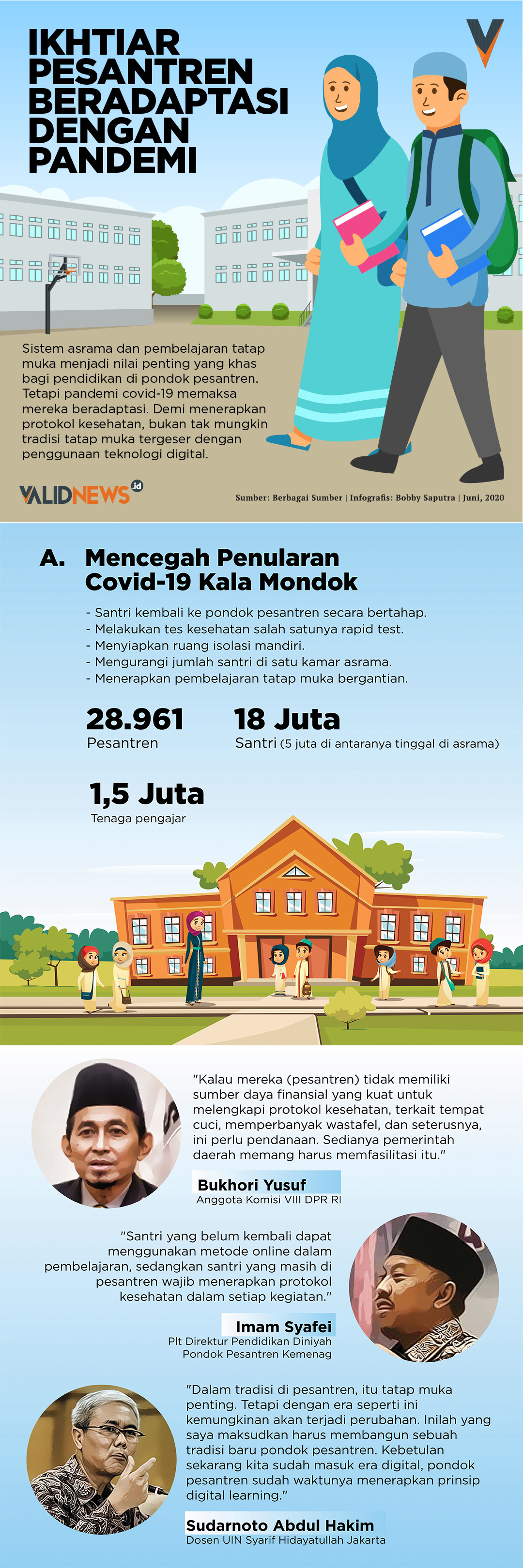 Kini sejumlah pondok pesantren pun sudah bersiap menerima kedatangan santri yang beberapa bulan lalu terpaksa dipulangkan. Termasuk menyiapkan penyesuaian tata cara para santri memondok dan belajar di kelas.