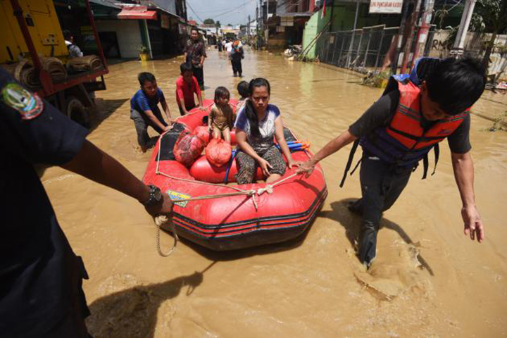 Petugas mengevakuasi warga yang sakit saat banjir melanda kawasan Perumahan Pondok Gede Permai, Jatiasih, Bekasi, Jawa Barat, Jumat (22/4). Akibat banjir yang terjadi sejak Kamis (21/4). ANTARA FOTO/Akbar Nugroho Gumay.