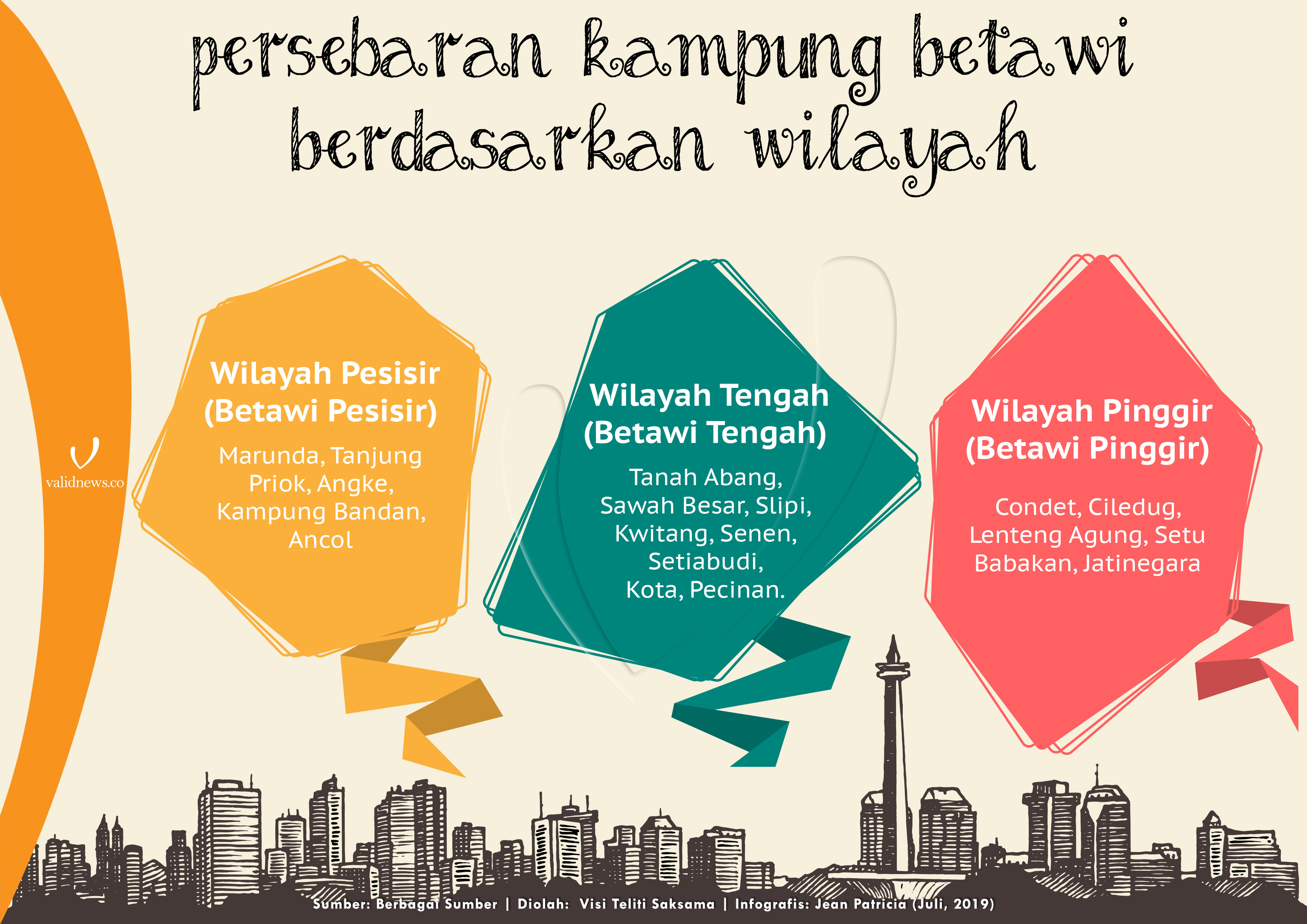 Sebut saja di Marunda, Tanjung Priok, Ancol sebagai Betawi Pesisir. Lalu Betawi tengah ada kawasan Tanah Abang, Sawah Besar, Slipi. Kemudian Betawi pinggir di Condet, Lenteng Agung, maupun Setu Babakan.