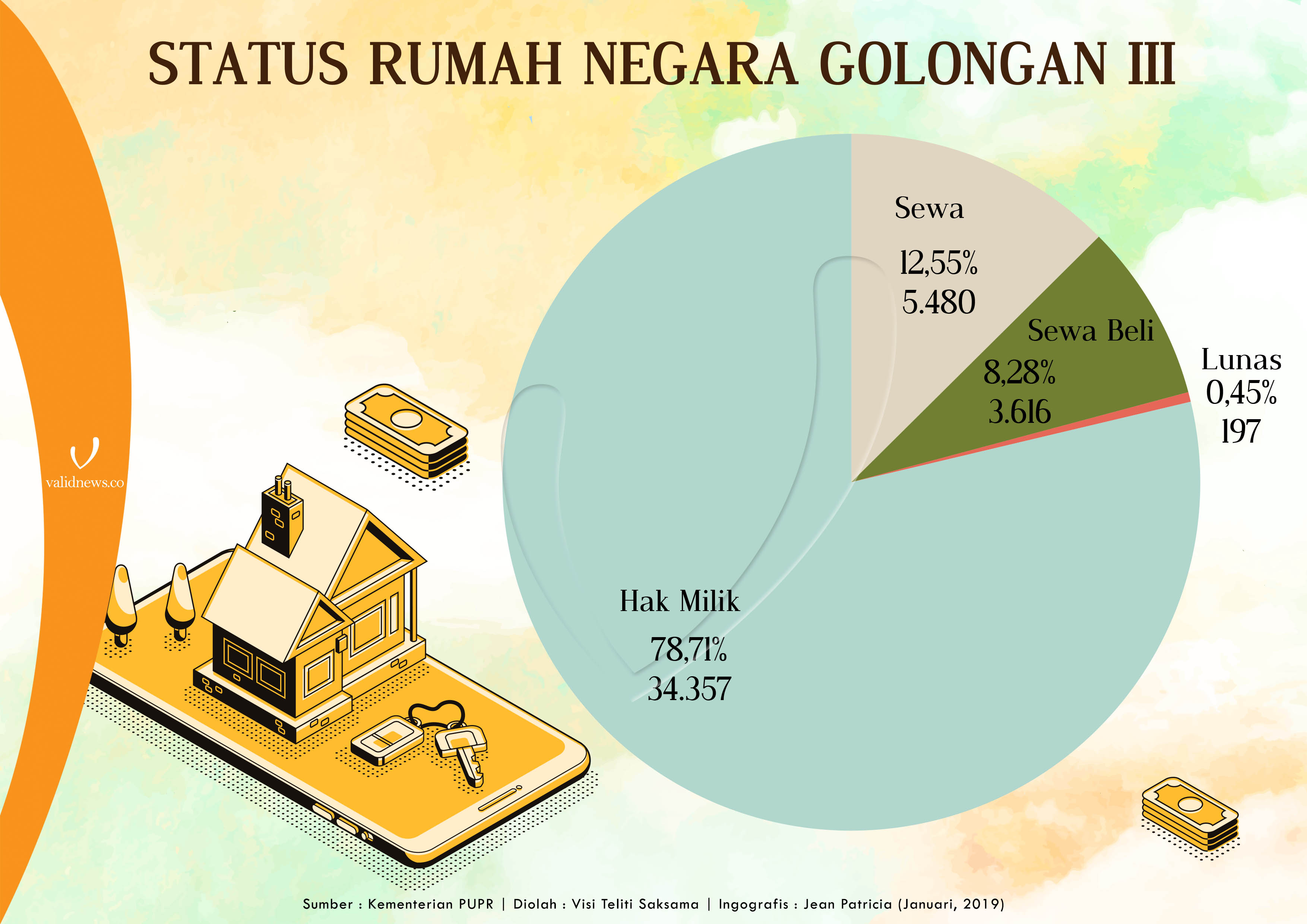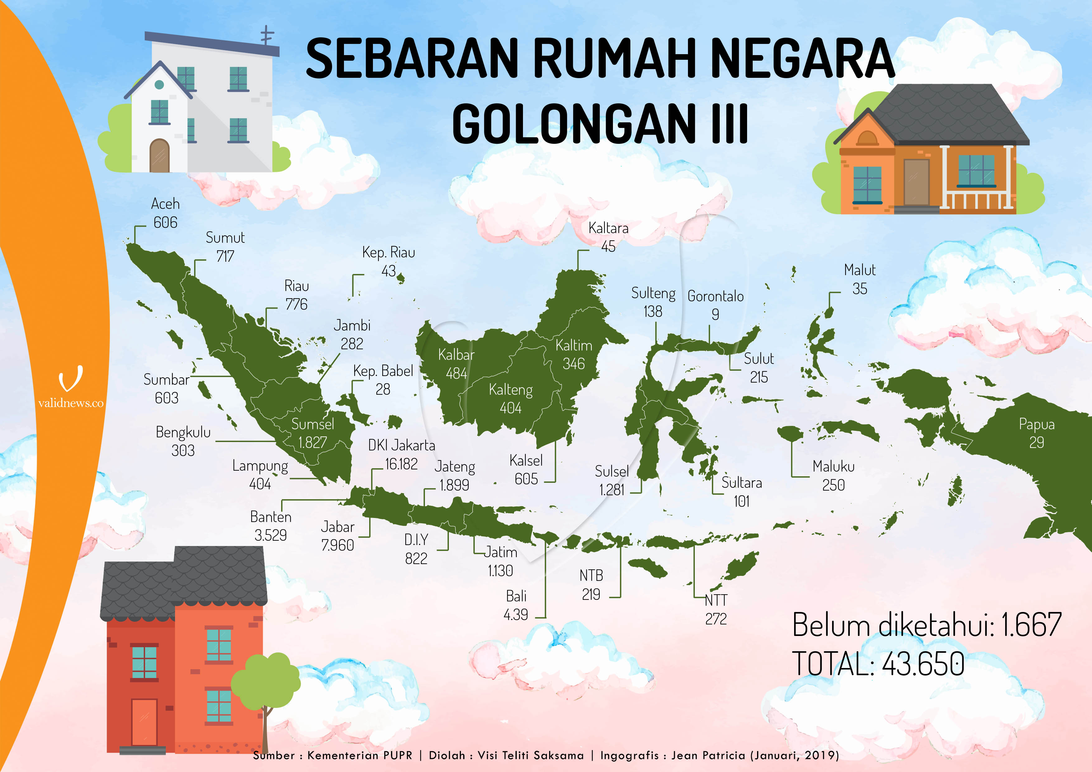 Melansir data yang dikeluarkan Kementerian PUPR, saat ini jumlah rumah negara golongan III di Indonesia ada sekitar 43,6 ribu unit. Dengan rumah dinas terbanyak berada di Jakarta dengan jumlah 16,18 ribu unit.