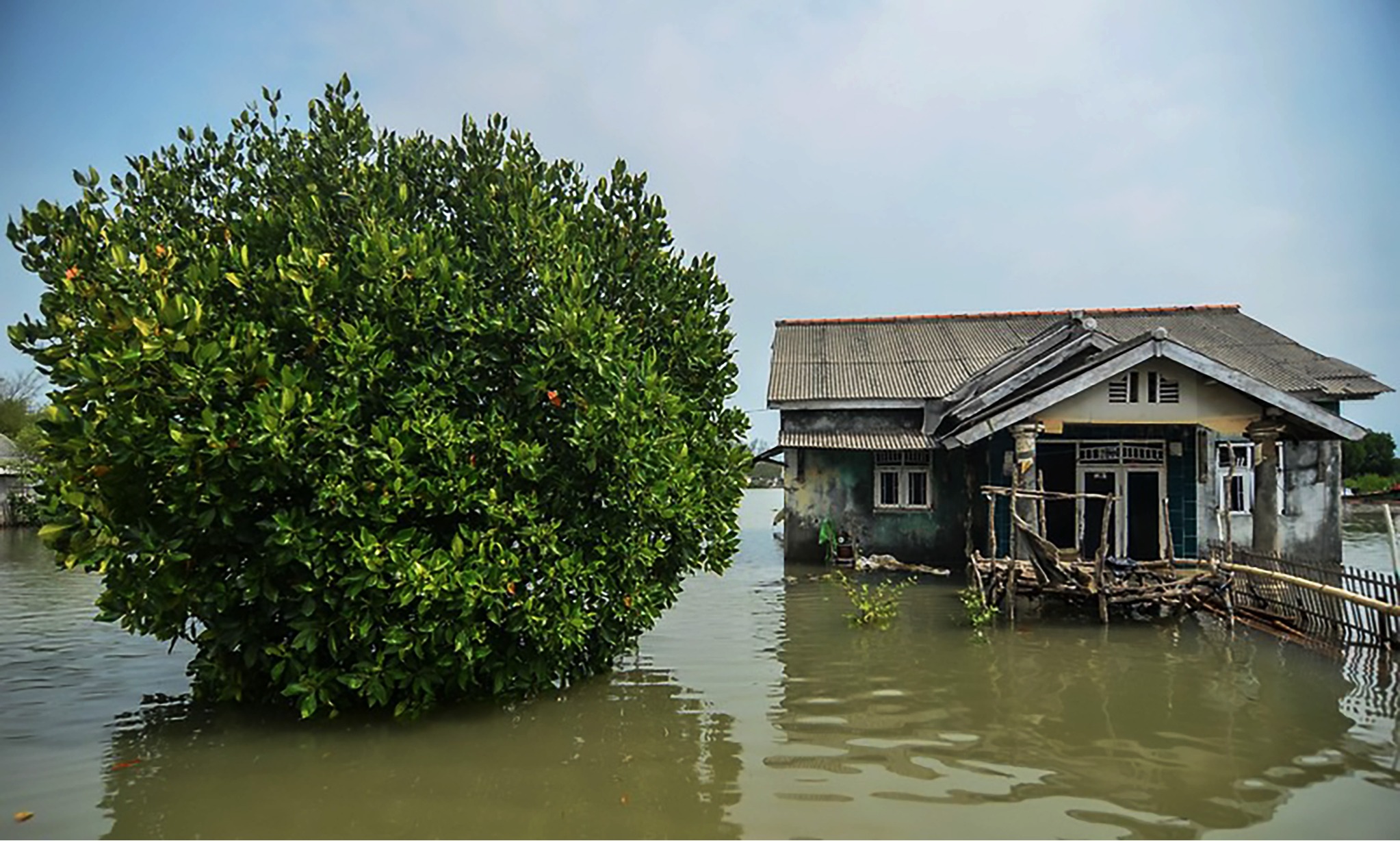 Sekolah Madrasah Ibtidaiyah (MI) Mansyaul Huda tergenang air laut akibat terdampak abrasi di Kampung Beting, Desa Pantai Bahagia, Kecamatan Muara Gembong, Kabupaten Bekasi, Jawa Barat. Antara Foto/Adeng Bustomi Tim Peneliti