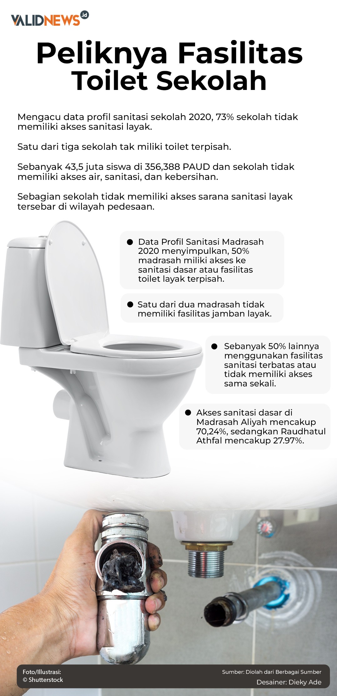 Namun, 73% sekolah di Indonesia tidak memiliki sanitasi yang layak. Begitu, data profil sanitasi sekolah dari Kementerian Pendidikan, Kebudayaan, Riset, dan Teknologi (Kemendikbudristek) 2020. Bahkan, satu dari tiga sekolah tidak memiliki toilet yang terpisah antara siswa laki-laki dan perempuan. Miris, bukan.
