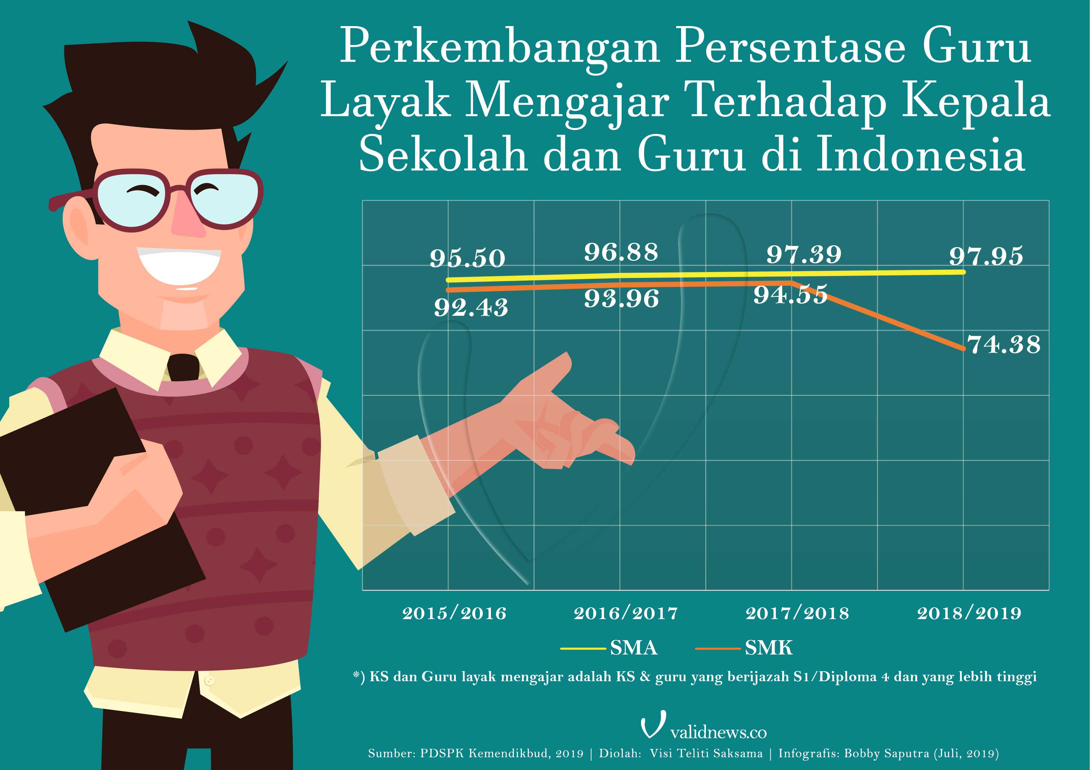 Data yang dihimpun dari Statistik Persekolahan SMA 2018/2019 (Kementerian Pendidikan dan Kebudayaan RI, 2015) menunjukkan bahwa persentase guru layak terhadap kepala sekolah dan guru di Indonesia pada periode ajar 2015/2016 ada dalam angka yang cukup tinggi, yakni 95,5%. Angka itu bahkan terus naik hingga pada periode 2018/2019 mencapai 97,95%. Kriteria kelayakan tersebut mengacu pada tenaga pengajar yang berijazah S1/Diploma 4 dan yang lebih tinggi.