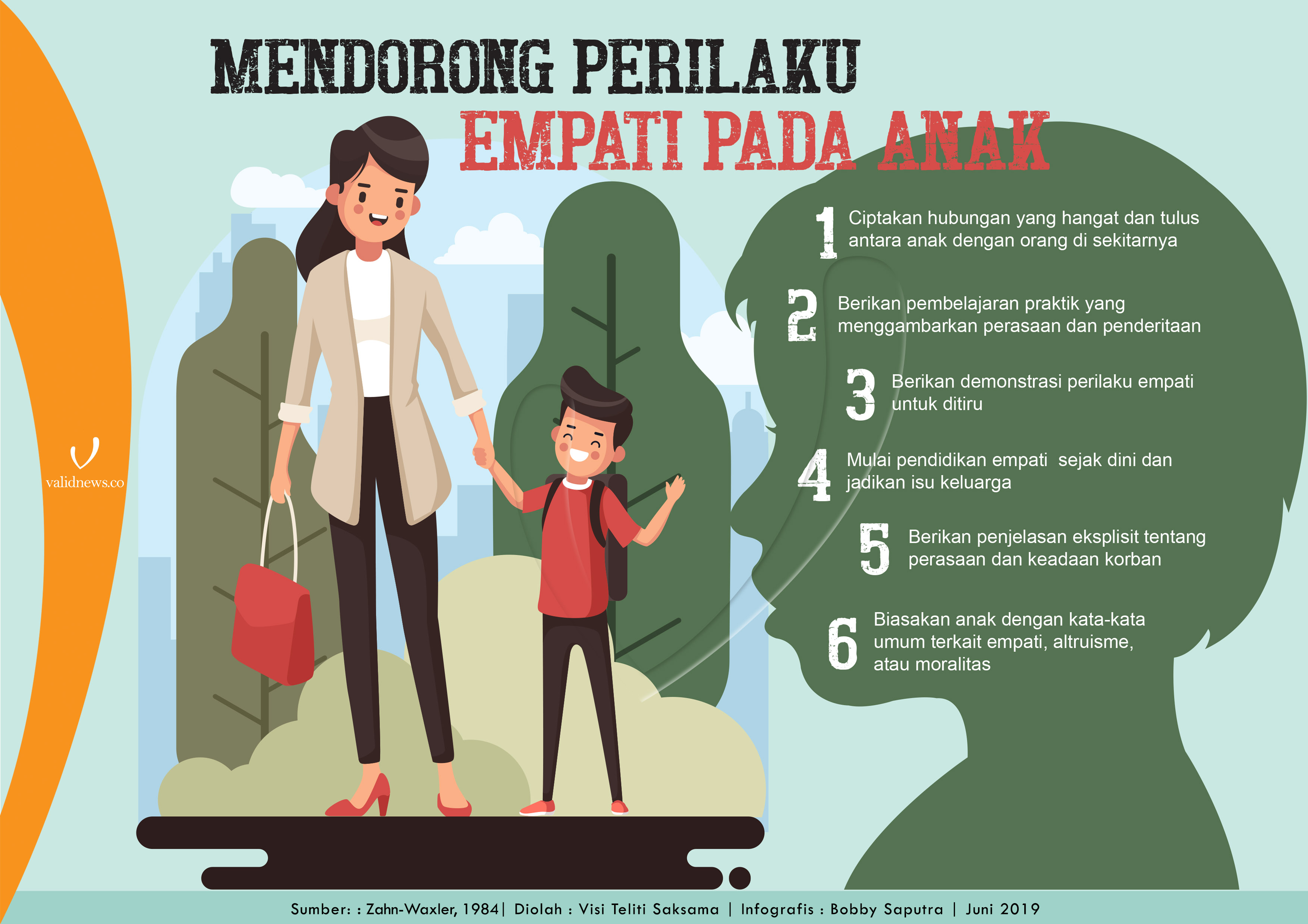 Melalui studinya, Carolyn Zahn-Waxler (1984) dan rekan-rekan penelitinya mengelompokkan beberapa kegiatan pembelajaran yang mampu mendukung terbentuknya perilaku empatik dan jiwa kemanusiaan kepada anak, misalnya pemberian contoh yang membuat anak mengerti penggambaran perasaan dan penderitaan. Dapat juga dilakukan praktik kegiatan pro-sosial di depan anak dengan tujuan peniruan. Begitu juga dapat dilakukan penjelasan eksplisit mengenai perasaan dan keadaan korban dalam suatu fenomena serta beberapa kegiatan lain yang dapat dilihat pada infografik di bawah ini.