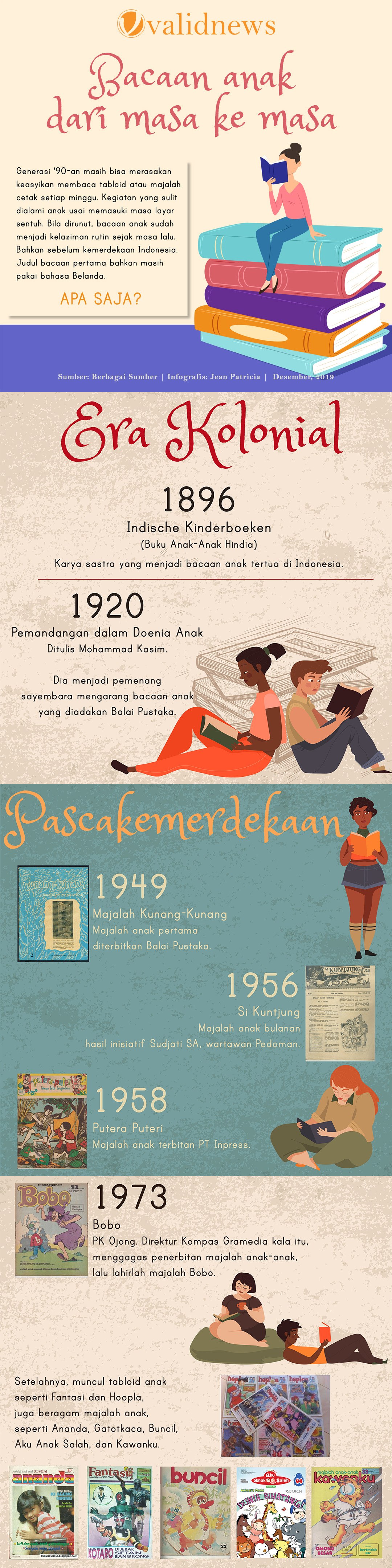 Masih eksis hingga kini, meski tidak terlalu cemerlang kepopulerannya, Bobo yang dinilai melegenda nyatanya bukanlah bacaan anak pertama di Indonesia. Pada 1896 tepatnya, terbit sebuah karya sastra anak berjudul Indische Kinderboeken (Buku Anak-Anak Hindia). Buku ini kemudian menjadi bacaan anak tertua di nusantara. Berganti abad, pada 1920, karangan berjudul “Pemandangan dalam Doenia Anak” karya penulis Mohammad Kasim menjadi pemenang sayembara mengarang bacaan anak yang diadakan Balai Pustaka.