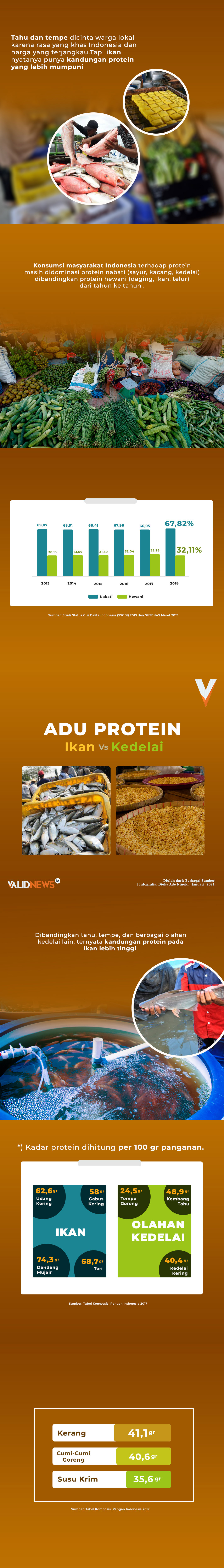 Bayangkan, dalam 100 gr masakan atau dendeng ikan mujair, ada kandungan protein sebesar 74,3 gr. Sementara itu, dalam jumlah yang sama, kembang tahu hanya mengandung 48,9 gr protein dan tempe goreng hanya punya 24,5 gr protein (Kementerian Kesehatan, 2018).