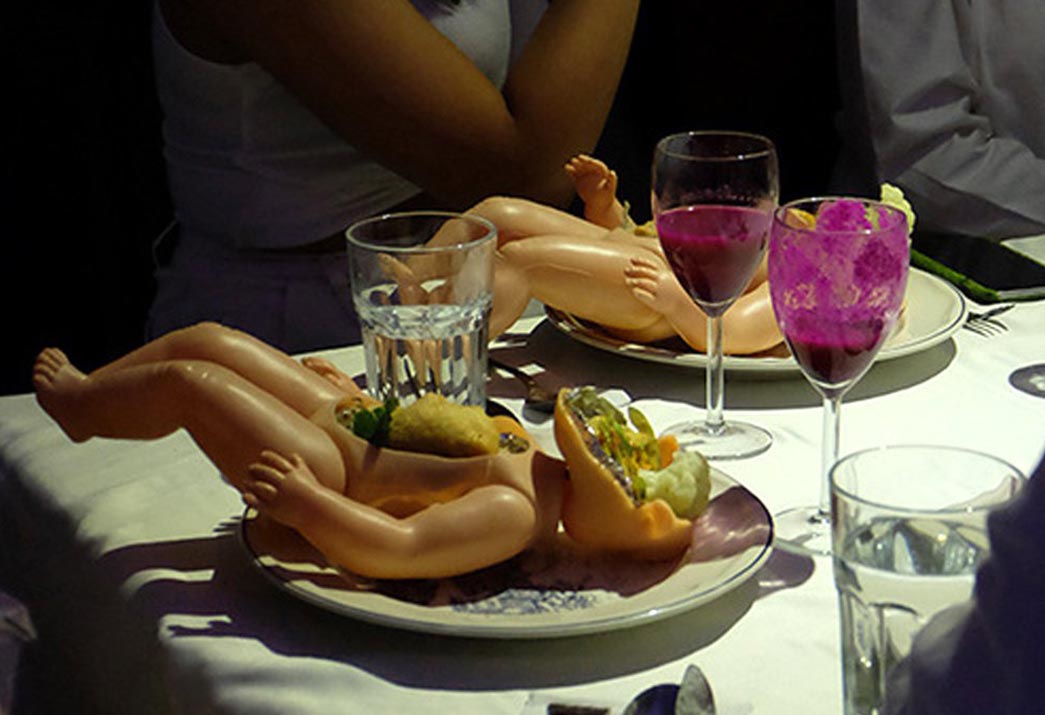 Judulnya memang ‘makan mayit’, tetapi makanan yang disediakan adalah makanan vegetarian, hanya saja disajikan di dalam piring berbentuk boneka bayi yang dibelah. Selain itu ada juga beberapa cemilan yang juga berbentuk bayi. Kegiatan ini pada akhirnya menghadirkan banyak pertentangan karena dianggap kurang sensitif dan beretika pada pasangan yang masih mengharapkan kehadiran bayi di keluarganya. Namun ada juga beberapa seniman yang mendukung dengan alasan kegiatan tersebut hanya merupakan bentuk ekspresi seni.