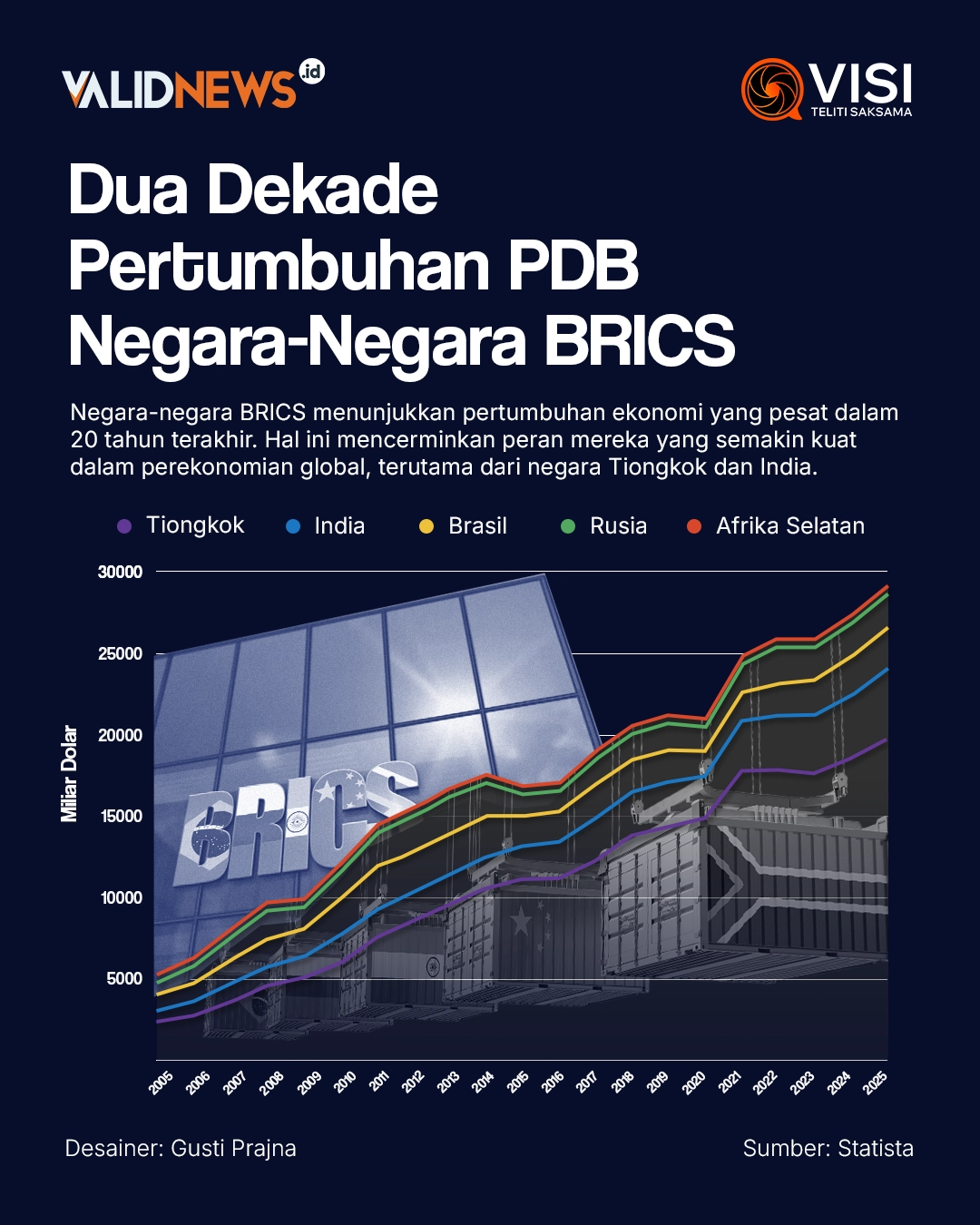 Mencermati perekonomian BRICS, berdasarkan data Statista, menunjukkan bahwa China merupakan negara anggota dengan PDB terbesar diantara negara-negara BRICS lainnya, yaitu sebesar 16,86 triliun dolar AS pada tahun 2021. Sementara negara-negara lainnya berada di bawah tiga triliun dolar AS. Secara keseluruhan, blok BRICS memiliki PDB lebih dari US$25,85 triliun pada tahun 2022. Jumlah tersebut sedikit lebih tinggi daripada Amerika Serikat. Tahun 2025 ini, diestimasikan PDB kelima negara BRICS (kecuali Indonesia) mencapai US$28,03 triliun (O'Neill, https://www.statista.com/statistics, 2025).