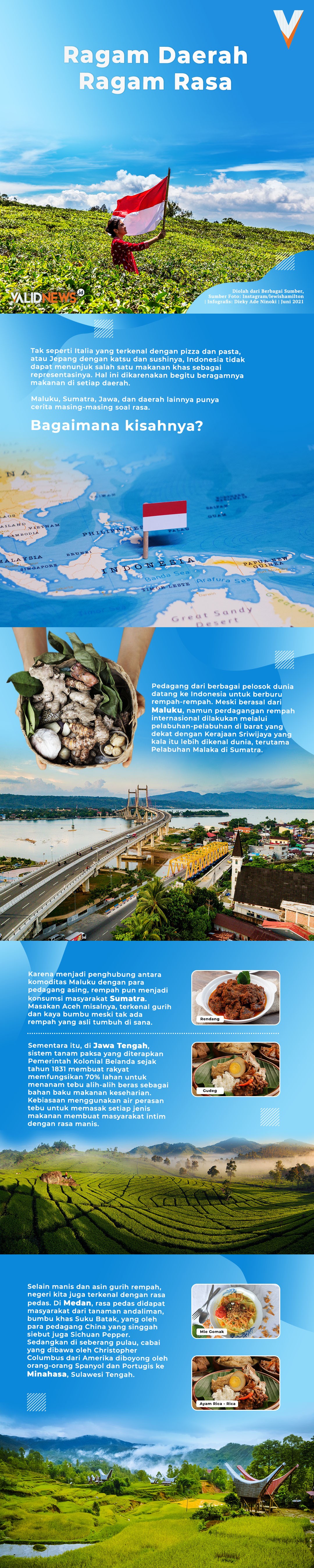 Akhirnya, nusantara memang punya segudang rasa. Selain rempah-rempah dari Maluku, berbagai makanan khas dari Sumatra, dan Jawa yang punya keintiman dengan rasa manis, ada rasa-rasa lain yang juga jadi ciri khas negeri kita. Sebut saja rasa pedas yang bermula ketika orang-orang Spanyol dan Portugis singgah di Sulawesi Tengah. Cabai yang dibawa oleh Christopher Columbus dari Amerika, mereka bawa ke Minahasa. Tak bisa ditinggalkan juga Suku Dayak yang sudah terbiasa tinggal di dalam hutan. Mereka tentunya sudah memiliki cara tersendiri dalam mengolah makanan yang menjadikannya salah satu kekhasan rasa kuliner kita. Lalu, dari bermacam-macamnya rasa dalam masakan Indonesia, yang mana nih yang paling Kamu suka?